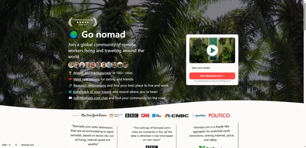 In short: it’s a membership-community + data platform built for remote workers and digital nomads. On the site you’ll find destination-ranking tools (cost, internet, visa, etc), travel-tracking features, meet-ups, a chat community, and filters to help you find “which city should I live or travel to next?”.